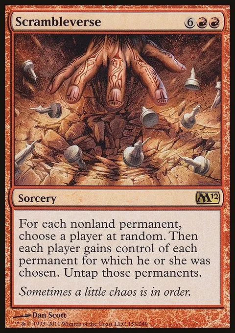 For each nonland permanent, choose a player at random. Then each player gains control of each permanent for which they were chosen. Untap those permanents.
