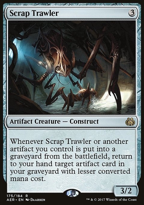 Whenever Scrap Trawler or another artifact you control is put into a graveyard from the battlefield, return to your hand target artifact card in your graveyard with lesser mana value.
