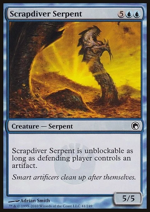 Scrapdiver Serpent can't be blocked as long as defending player controls an artifact.