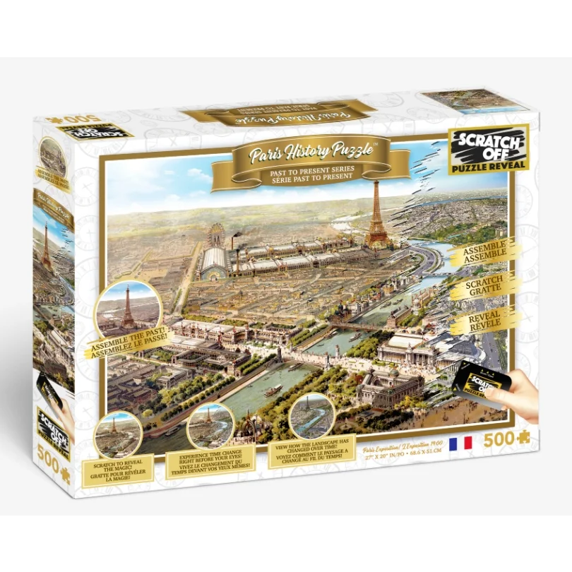 4D now introduces you Scratch-Off Puzzles, the greatest innovation to the jigsaw puzzle in over a decade! This patented puzzle is genius. You first assemble the puzzle, then you scratch the top layer to either mark, alter, or reveal a new image! See the magic as the image changes before your eyes. When complete, you can turn over the puzzle to retain the original puzzle art you assembled. This extra activity of fun brings a whole new dimension and education value! Product measures 70cm x 50cm, consists of 500PCS and comes with a Scratch Tooland a Scratch Brush