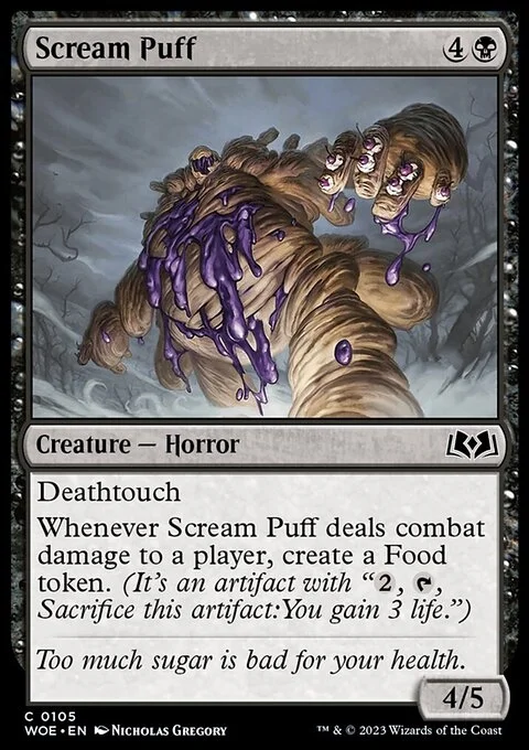 Deathtouch Whenever this creature deals combat damage to a player, create a Food token. (It's an artifact with "{2}, {T}, Sacrifice this token: You gain 3 life.")