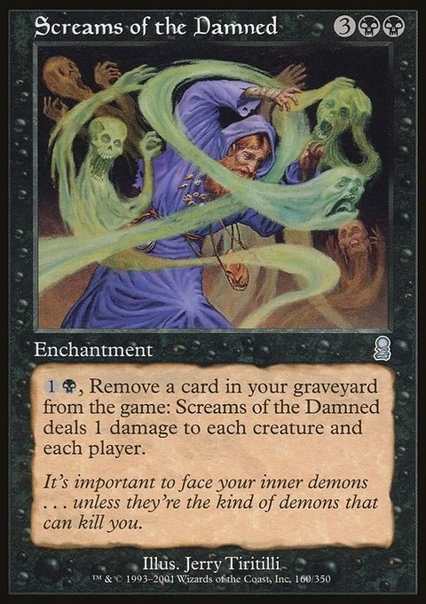 1B, Remove a card in your graveyard from the game: Screams of the Damned deals 1 damage to each creature and each player.
