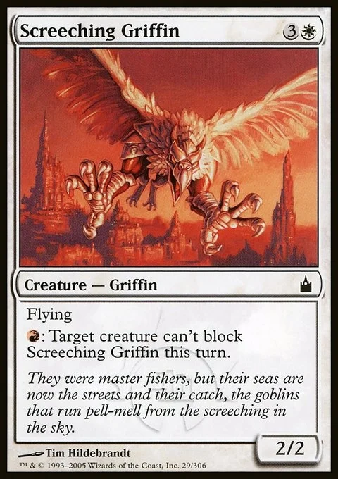 Flying {R}: Target creature can't block Screeching Griffin this turn.