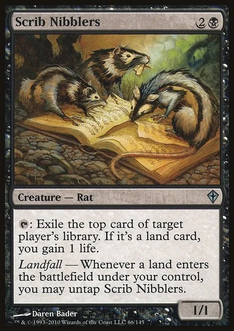 {T}: Exile the top card of target player's library. If it's a land card, you gain 1 life. Landfall — Whenever a land enters the battlefield under your control, you may untap Scrib Nibblers.