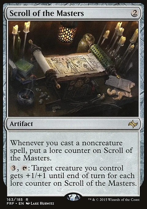 Whenever you cast a noncreature spell, put a lore counter on Scroll of the Masters. {3}, {T}: Target creature you control gets +1/+1 until end of turn for each lore counter on Scroll of the Masters.