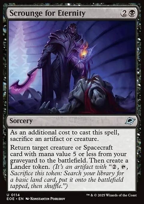 Return target creature or Spacecraft card with mana value 5 or less from your graveyard to the battlefield. Then create a Lander token. (It's an artifact with "{2}, {T}, Sacrifice this token: Search your library for a basic land card, put it onto the battlefield tapped, then shuffle.")