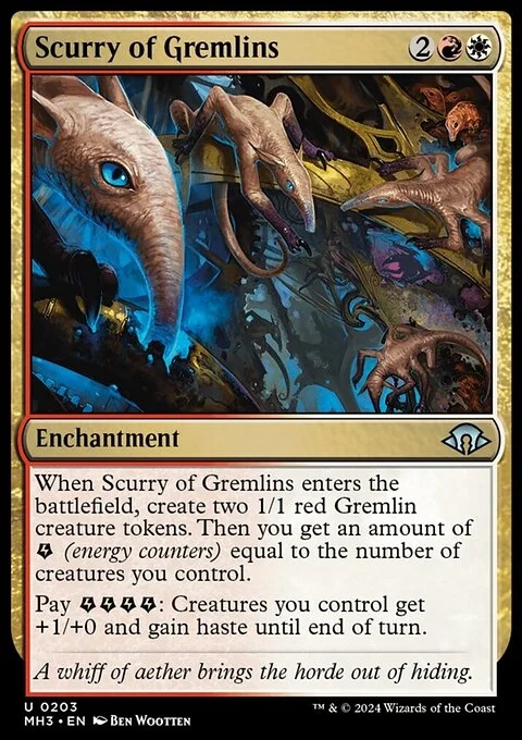 When Scurry of Gremlins enters the battlefield, create two 1/1 red Gremlin creature tokens. Then you get an amount of {E} (energy counters) equal to the number of creatures you control. Pay {E}{E}{E}{E}: Creatures you control get +1/+0 and gain haste until end of turn.