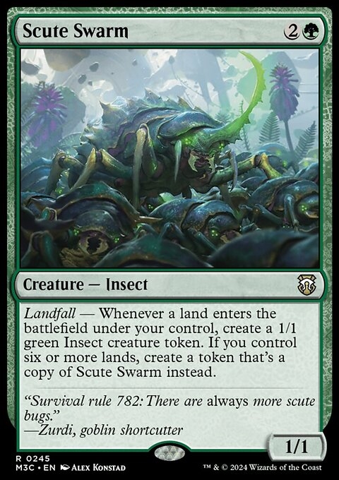 Landfall — Whenever a land you control enters, create a 1/1 green Insect creature token. If you control six or more lands, create a token that's a copy of this creature instead.