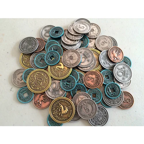 These 80 custom metal coins are designed specifically for Scythe by artist Jakub Rozalski. They include denominations of $1, $3, $5, $10, and $20. They’re made of zinc.