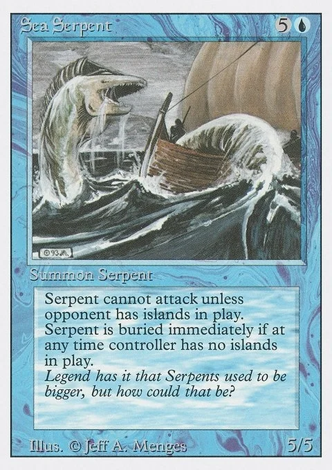 Sea Serpent can't attack unless defending player controls an Island. When you control no Islands, sacrifice Sea Serpent.