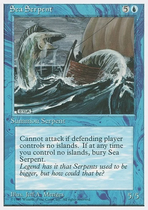 Sea Serpent can't attack unless defending player controls an Island. When you control no Islands, sacrifice Sea Serpent.