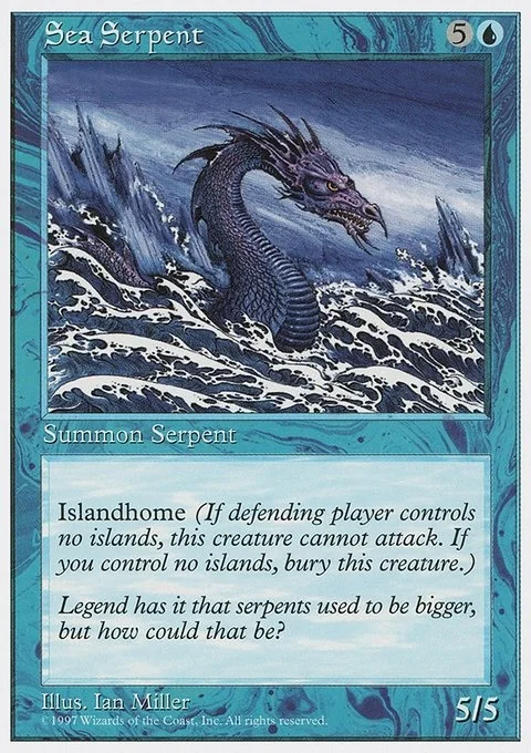 Sea Serpent can't attack unless defending player controls an Island. When you control no Islands, sacrifice Sea Serpent.