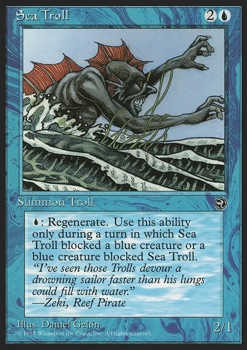 U: Regenerate. Use this ability only during a turn in which Sea Troll blocked a blue creature or a blue creature blocked Sea Troll.