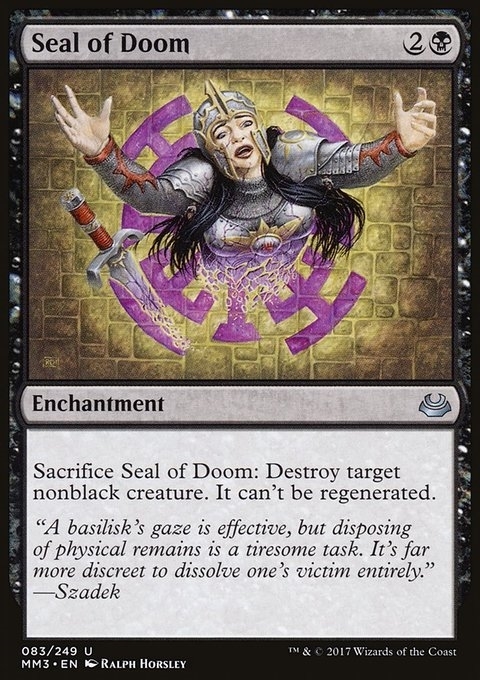 Sacrifice Seal of Doom: Destroy target nonblack creature. It can't be regenerated.
