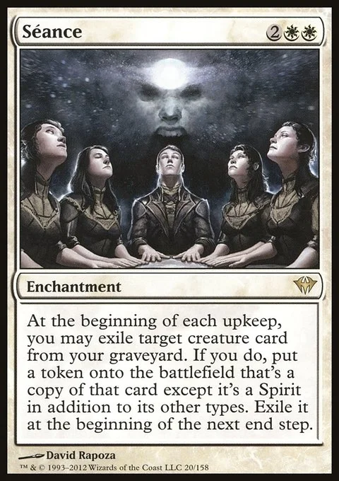 At the beginning of each upkeep, you may exile target creature card from your graveyard. If you do, create a token that's a copy of that card, except it's a Spirit in addition to its other types. Exile it at the beginning of the next end step.