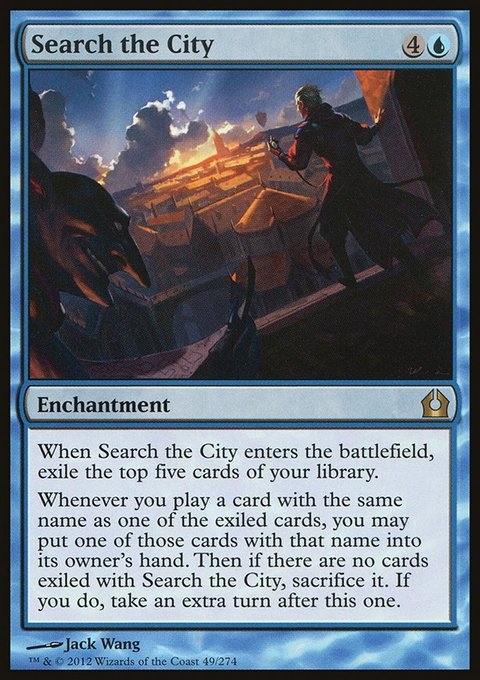 Whenever you play a card with the same name as one of the exiled cards, you may put one of those cards with that name into its owner's hand. Then if there are no cards exiled with Search the City, sacrifice it. If you do, take an extra turn after this one.