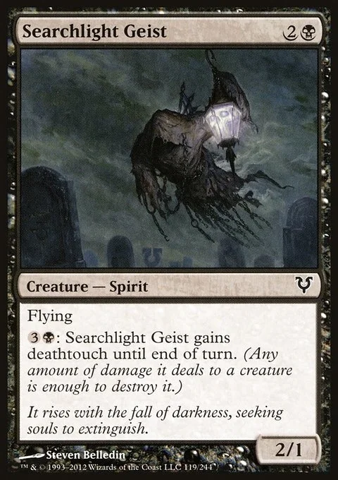 Flying {3}{B}: Searchlight Geist gains deathtouch until end of turn. (Any amount of damage it deals to a creature is enough to destroy it.)