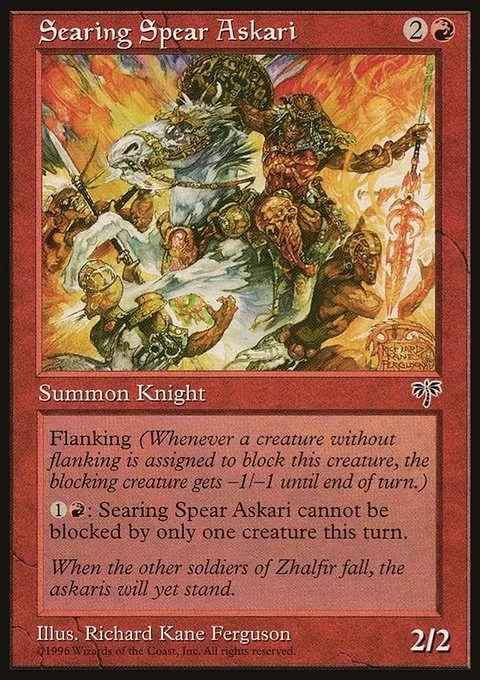 Flanking (Whenever a creature without flanking blocks this creature, the blocking creature gets -1/-1 until end of turn.) {1}{R}: Searing Spear Askari gains menace until end of turn. (It can't be blocked except by two or more creatures.)