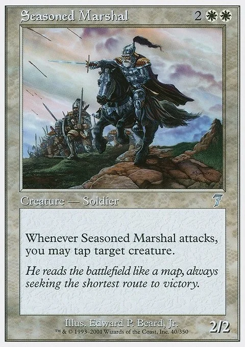 Whenever Seasoned Marshal attacks, you may tap target creature.