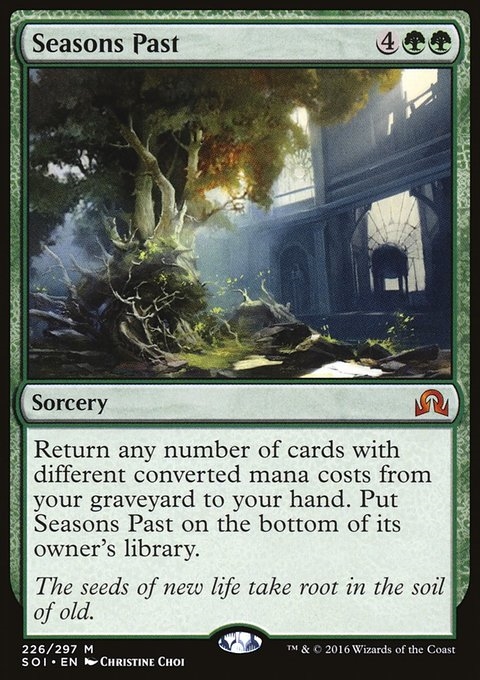 Return any number of cards with different mana values from your graveyard to your hand. Put Seasons Past on the bottom of its owner's library.