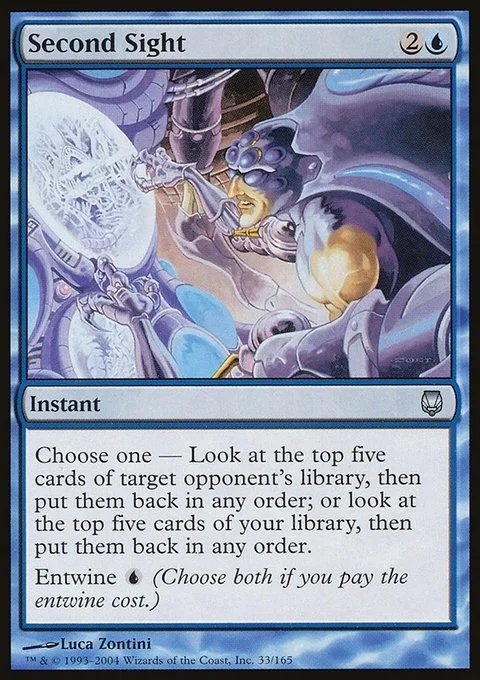 Choose one — • Look at the top five cards of target opponent's library, then put them back in any order. • Look at the top five cards of your library, then put them back in any order. Entwine {U} (Choose both if you pay the entwine cost.)