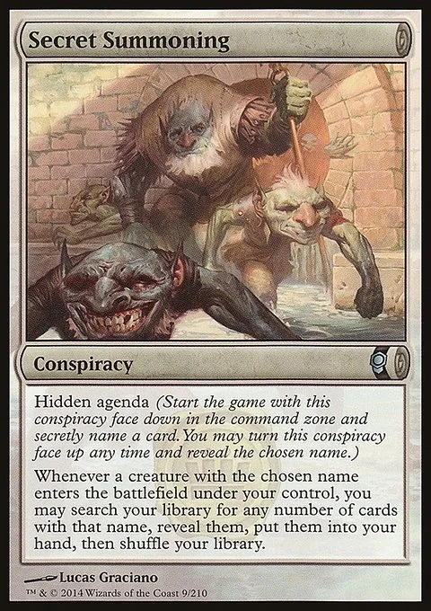 Hidden agenda (Start the game with this conspiracy face down in the command zone and secretly choose a card name. You may turn this conspiracy face up any time and reveal that name.)