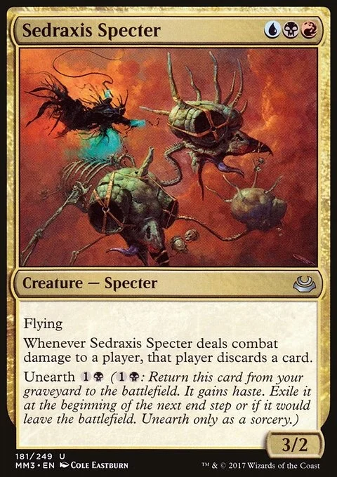 Flying Whenever Sedraxis Specter deals combat damage to a player, that player discards a card. Unearth {1}{B} ({1}{B}: Return this card from your graveyard to the battlefield. It gains haste. Exile it at the beginning of the next end step or if it would leave the battlefield. Unearth only as a sorcery.)