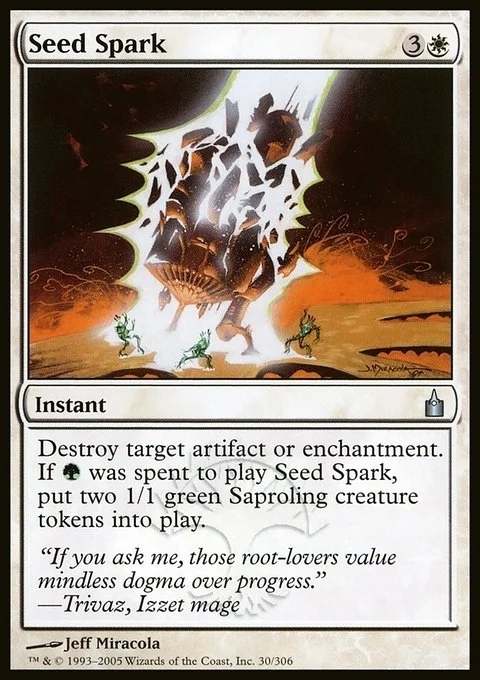 Destroy target artifact or enchantment. If {G} was spent to cast this spell, create two 1/1 green Saproling creature tokens.