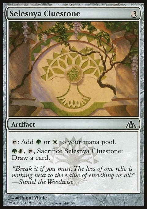 {T}: Add {G} or {W}. {G}{W}, {T}, Sacrifice Selesnya Cluestone: Draw a card.