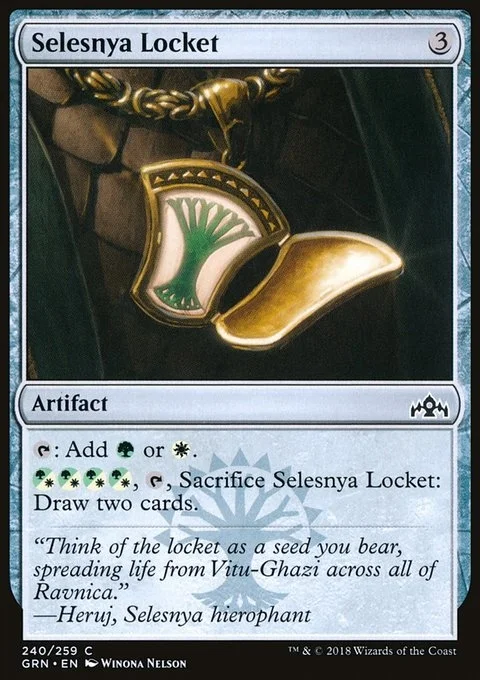 {T}: Add {G} or {W}. {G/W}{G/W}{G/W}{G/W}, {T}, Sacrifice this artifact: Draw two cards.