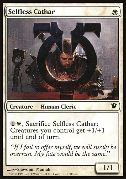 {1}{W}, Sacrifice Selfless Cathar: Creatures you control get +1/+1 until end of turn.