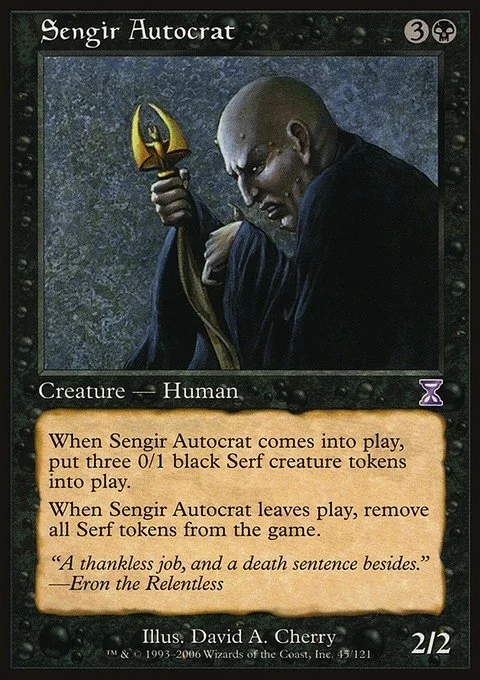 When Sengir Autocrat enters the battlefield, create three 0/1 black Serf creature tokens. When Sengir Autocrat leaves the battlefield, exile all Serf tokens.