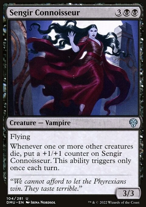 Flying Whenever one or more other creatures die, put a +1/+1 counter on Sengir Connoisseur. This ability triggers only once each turn.