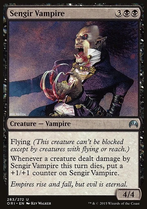 Flying (This creature can't be blocked except by creatures with flying or reach.) Whenever a creature dealt damage by Sengir Vampire this turn dies, put a +1/+1 counter on Sengir Vampire.