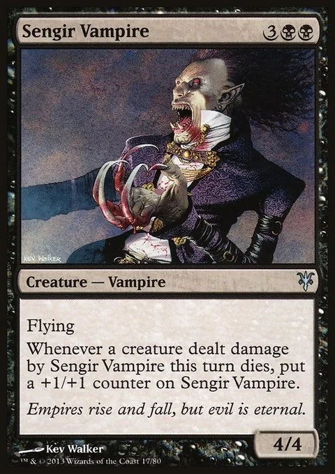 Flying (This creature can't be blocked except by creatures with flying or reach.) Whenever a creature dealt damage by Sengir Vampire this turn dies, put a +1/+1 counter on Sengir Vampire.