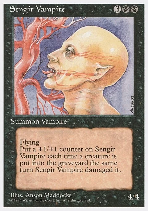 FlyingPut a +1/+1 counter on Sengir Vampire each time a creature is put into the graveyard the same turn Sengir Vampire damaged it.
