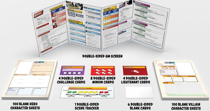 Playing SCRPG involves the players working together with the GM, helping their heroes play to their principles and ultimately save the day... but at what cost?! GMs frequently need to come up with twists on the fly in action scenes, or create minions in response to hero or villain actions. To make your job as GM easier, we’ve created a kit of useful GM supplies.