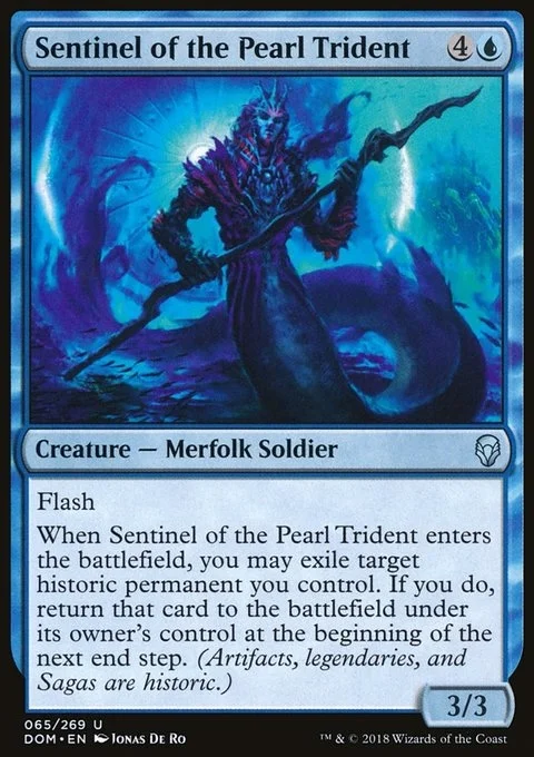 Flash When Sentinel of the Pearl Trident enters the battlefield, you may exile target historic permanent you control. If you do, return that card to the battlefield under its owner's control at the beginning of the next end step. (Artifacts, legendaries, and Sagas are historic.)
