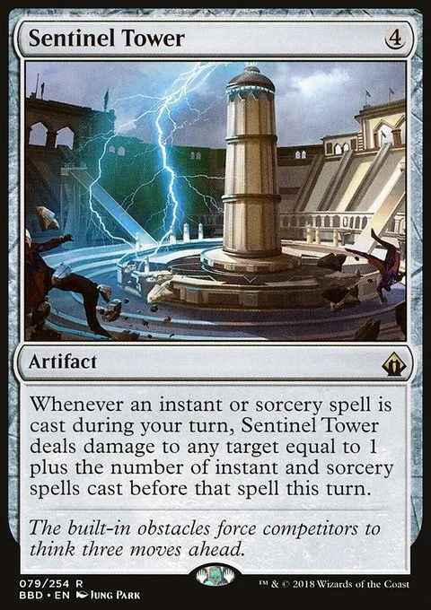 Whenever an instant or sorcery spell is cast during your turn, Sentinel Tower deals damage to any target equal to 1 plus the number of instant and sorcery spells cast before that spell this turn.