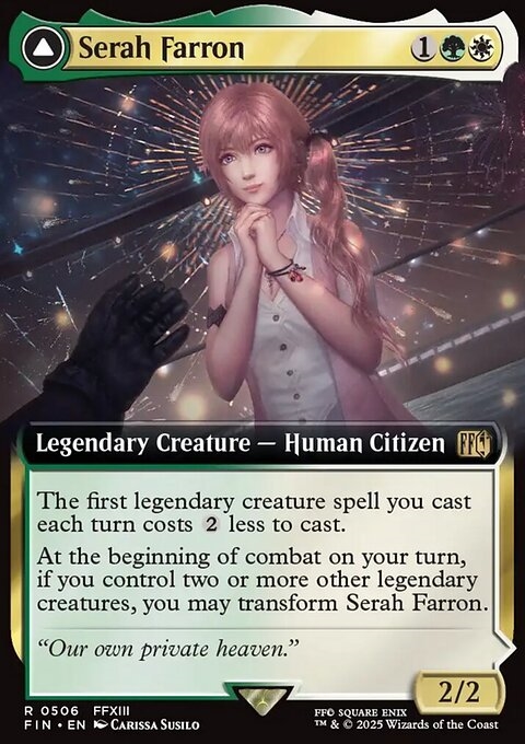 At the beginning of combat on your turn, if you control two or more other legendary creatures, you may transform Serah Farron.