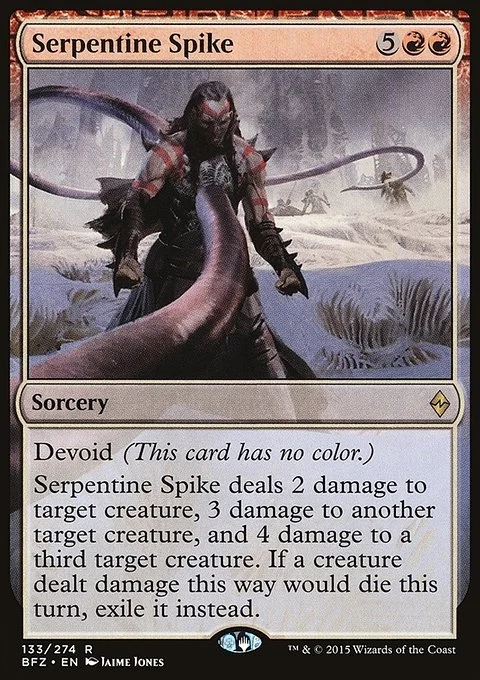 Devoid (This card has no color.) Serpentine Spike deals 2 damage to target creature, 3 damage to another target creature, and 4 damage to a third target creature. If a creature dealt damage this way would die this turn, exile it instead.