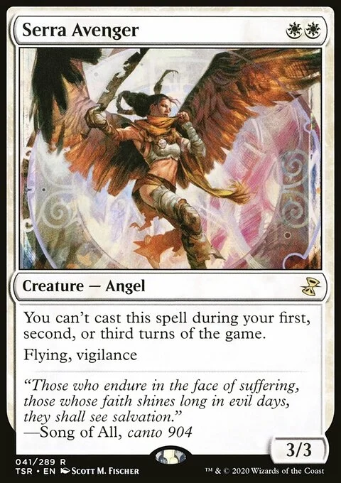 You can't cast this spell during your first, second, or third turns of the game. Flying, vigilance
