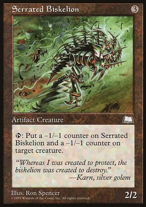 T: Put a -1/-1 counter on Serrated Biskelion and a -1/-1 counter on target creature.