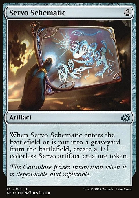 When Servo Schematic enters the battlefield or is put into a graveyard from the battlefield, create a 1/1 colorless Servo artifact creature token.