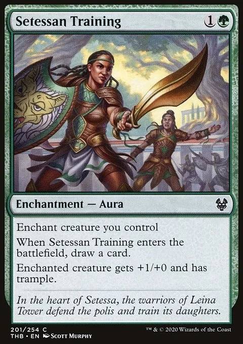 Enchant creature you control When this Aura enters, draw a card. Enchanted creature gets +1/+0 and has trample. (It can deal excess combat damage to the player or planeswalker it's attacking.)