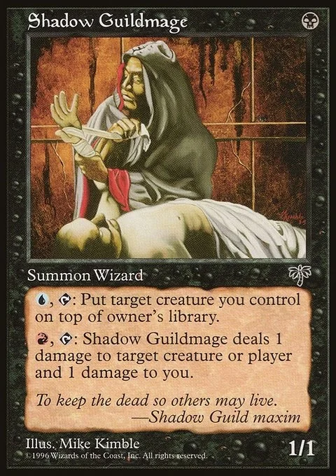 {U}, {T}: Put target creature you control on top of its owner's library. {R}, {T}: Shadow Guildmage deals 1 damage to any target and 1 damage to you.