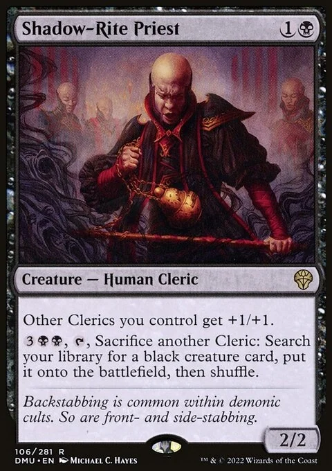 Other Clerics you control get +1/+1. {3}{B}{B}, {T}, Sacrifice another Cleric: Search your library for a black creature card, put it onto the battlefield, then shuffle.