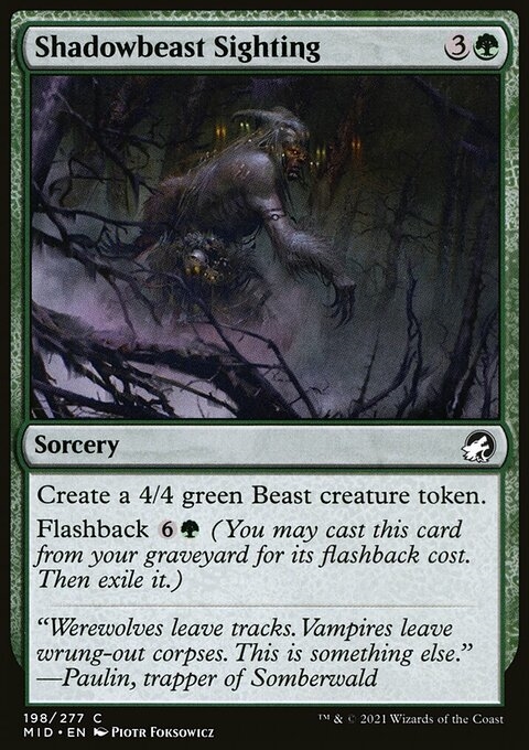 Create a 4/4 green Beast creature token. Flashback {6}{G} (You may cast this card from your graveyard for its flashback cost. Then exile it.)