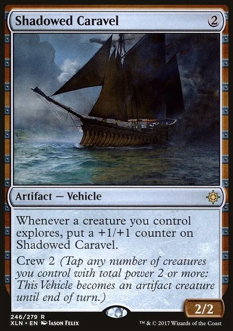 Whenever a creature you control explores, put a +1/+1 counter on Shadowed Caravel. Crew 2 (Tap any number of creatures you control with total power 2 or more: This Vehicle becomes an artifact creature until end of turn.)