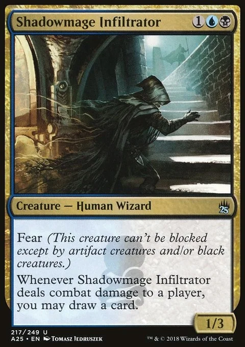 Fear (This creature can't be blocked except by artifact creatures and/or black creatures.) Whenever Shadowmage Infiltrator deals combat damage to a player, you may draw a card.